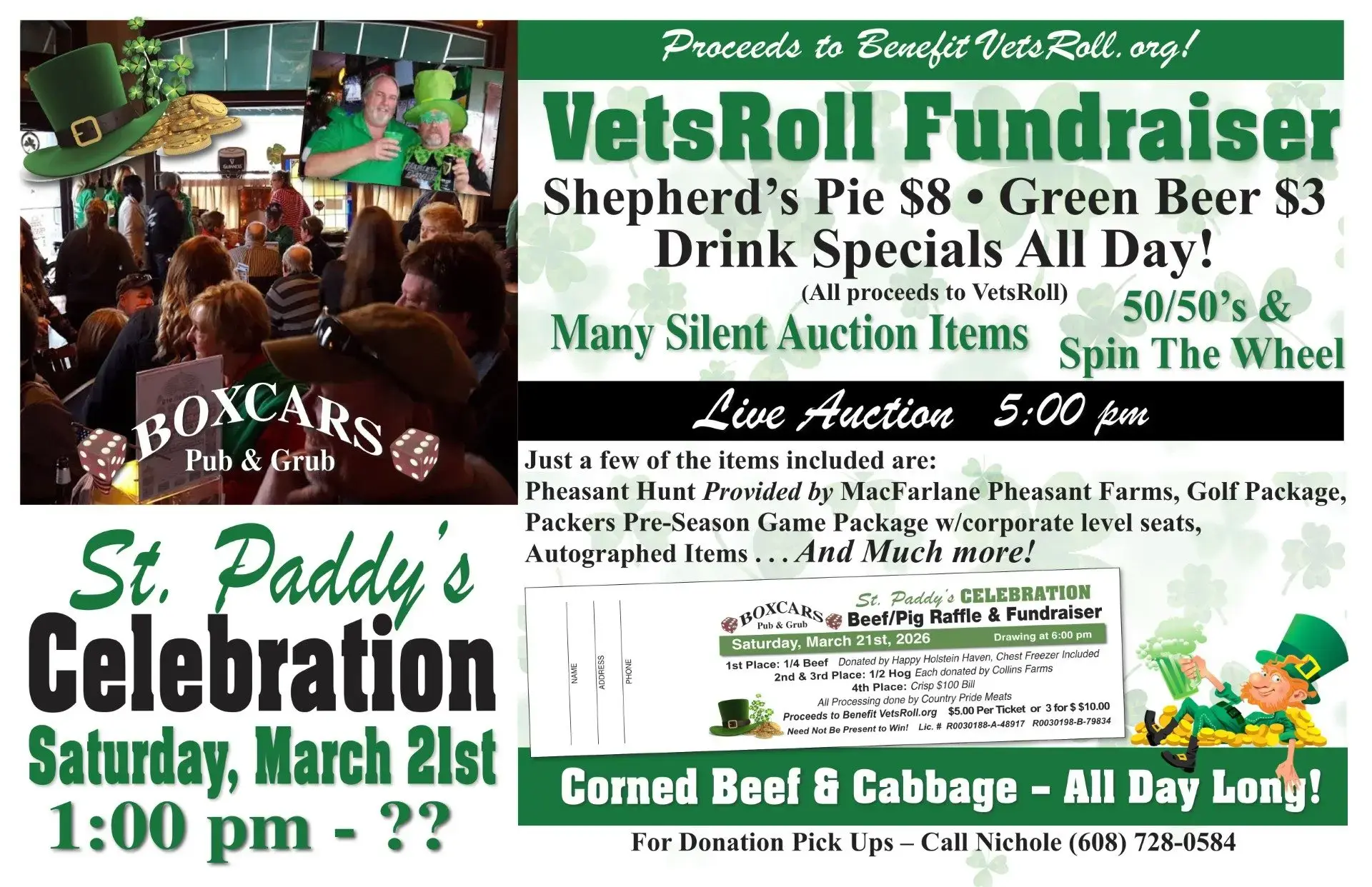 Join us in raising money to send our Veterans to Washington D.C. to visit their memorials. All with a St. Paddy’s Day theme. There will be food and drink specials all day with proceeds going to VetsRoll. Live aution starting at 5pm featuring Golf Packages, Pheasant Hunt from MacFarlane Pheasant Farms, Green Bay Packers Pre-Season Game Package, Autographed Items and so much more! Silent auction starts at 1pm with tons of items! Spin the Wheel, 50/50’s, and so much more! Get your Clan together and come on out for an amazing good time all for VetsRoll