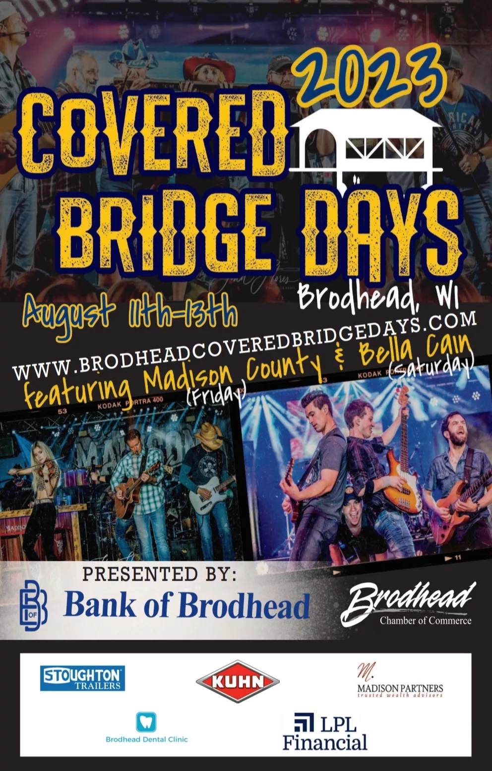 Be sure to mark August 11-13 on your calendar for Covered Bridge Days in Brodhead, Wisconsin! We’re excited to welcome back a local favorite, high-energy country show band, Madison County on Friday night, and a regional powerhouse, hottest top 40 country band in the Midwest, Bella Cain, on Saturday night! Two great shows with no cover charge!