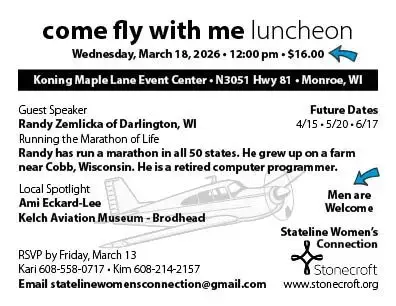 Stateline Women’s Connection Luncheon Randy Zemlicka of Darlington, WI will be the guest speaker Local Spotlight: Ami Eckard-Lee – Kelch Aviation Museum, Brodhead