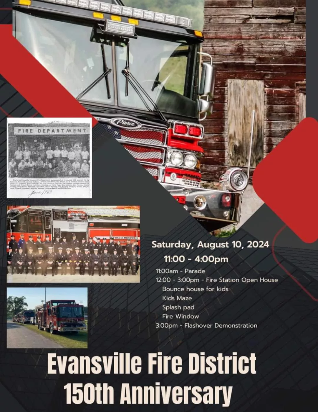The day starts with a Fire truck parade through town followed by an open house with kids activities and demonstrations and a meal at the Evansville fire station