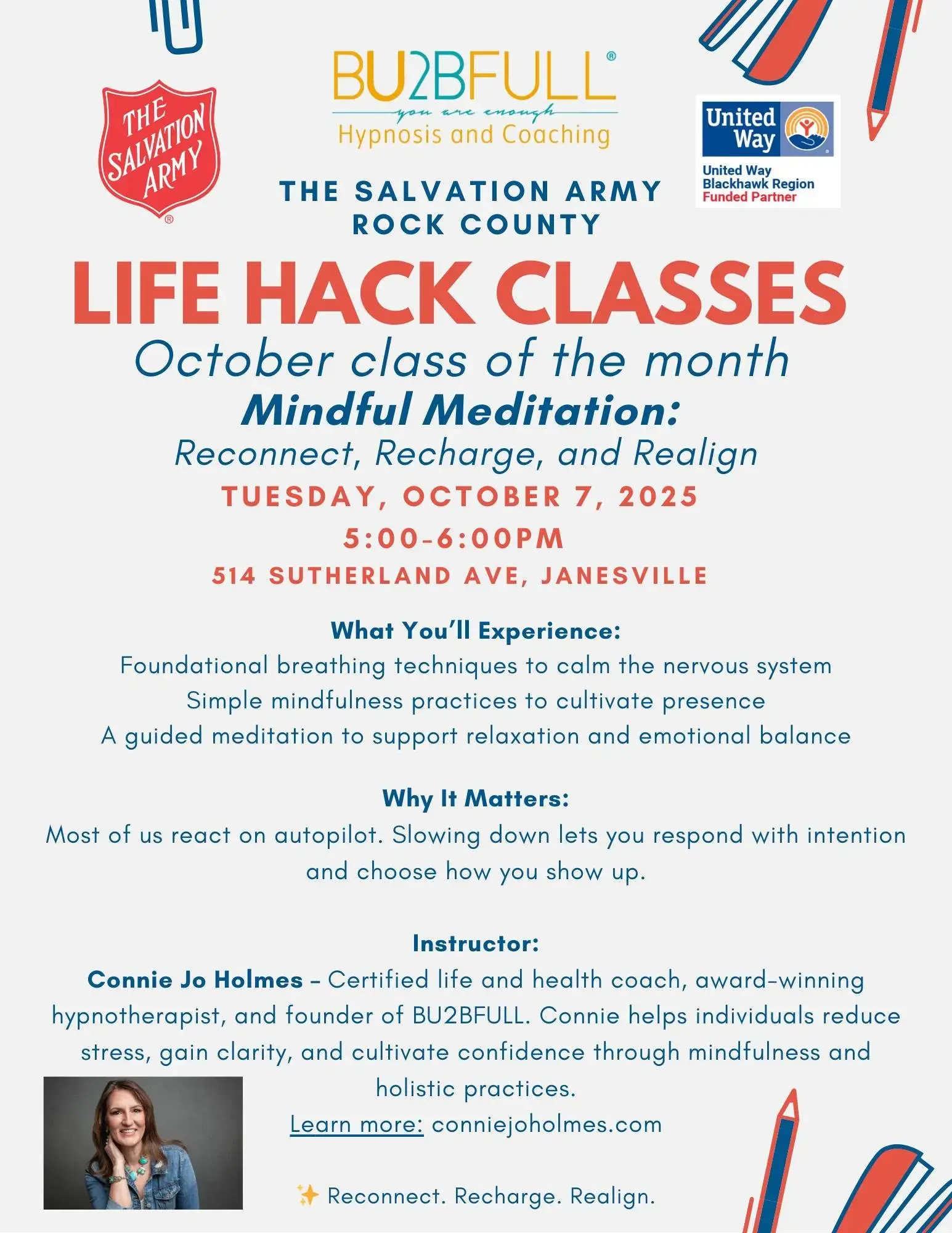 Connie Jo Holmes – Certified life and health coach, award-winning hypnotherapist, and founder of BU2BFULL. Connie brings over 30 years of experience helping people reduce stress, gain clarity, and build confidence through mindfulness and holistic practices. Learn more: conniejoholmes.com