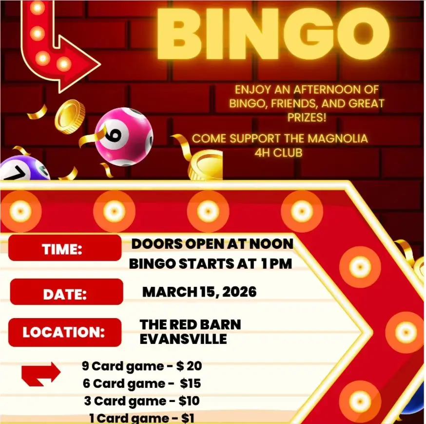 Magnolia 4H Club, in Evansville, WI, is excited to announce our upcoming Bingo Fundraiser on March 15th, 2026.