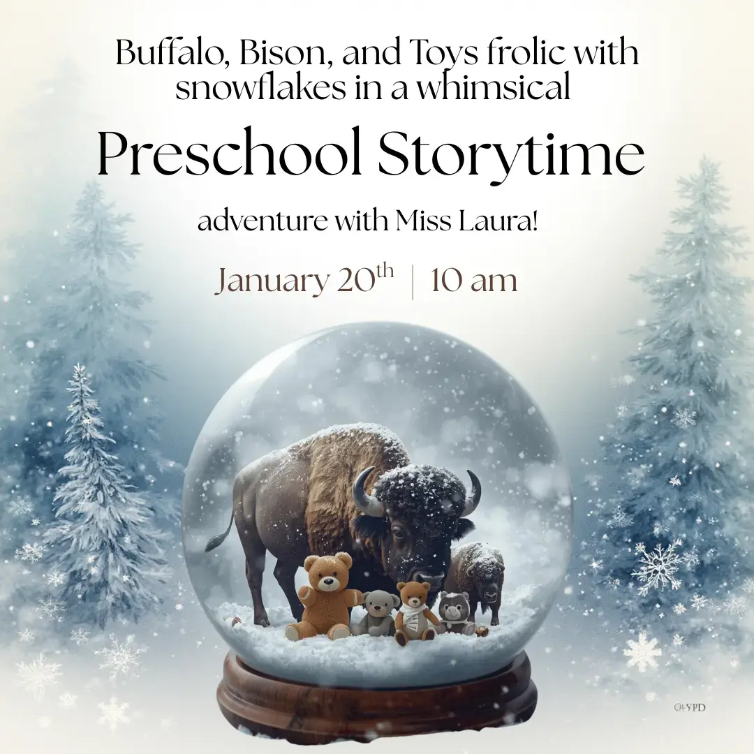 Buffalo, bison, and toys frolic with snowflakes in a whimsical Preschool Storytime adventure with Miss Laura on January 20th at 10 am!