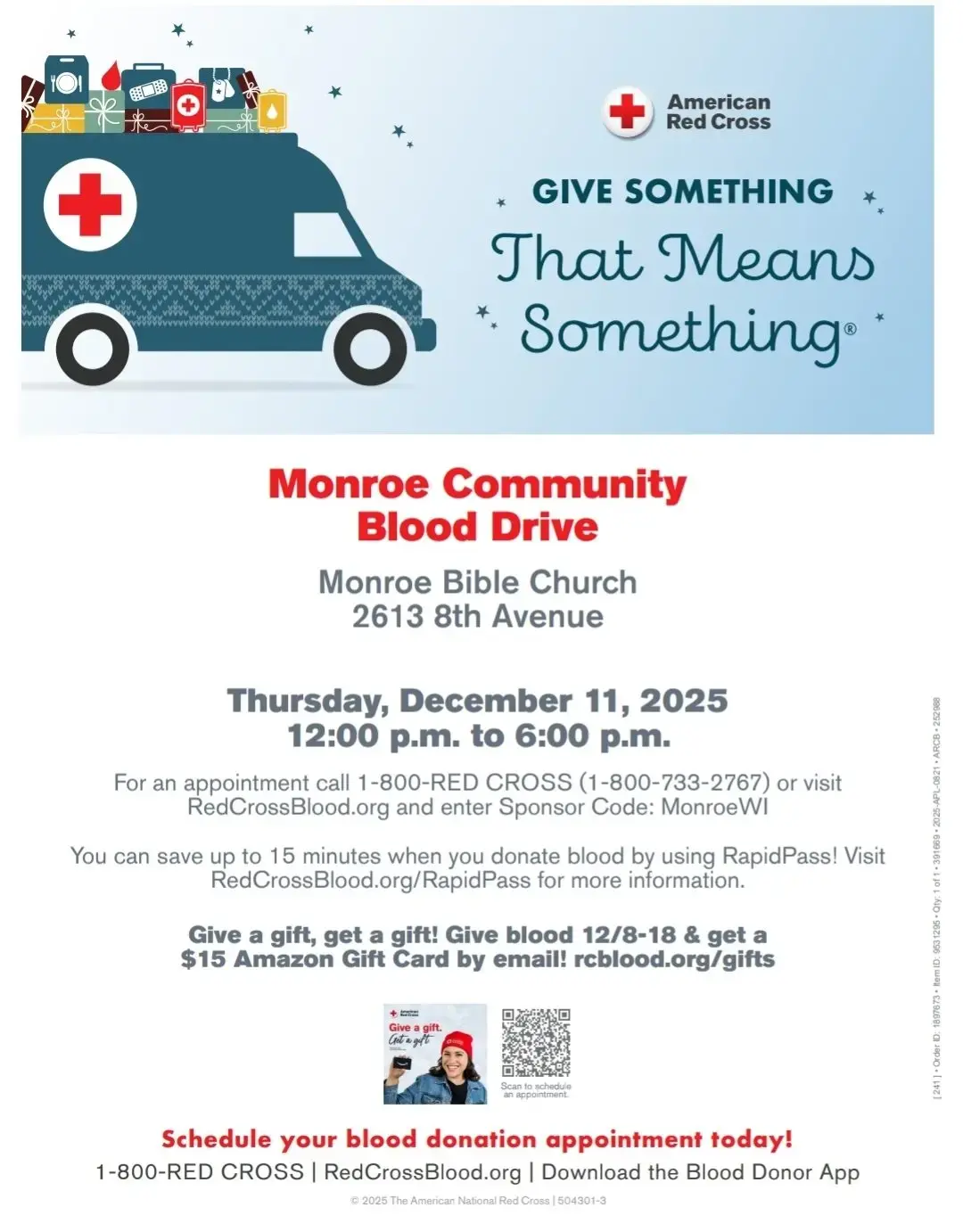 Red cross blood drive at monroe bible church. 2613 8th Ave, Monroe, WI. Make an appointment at https://www.redcrossblood.org or call 1 800 RED CROS. There is a $15 amazon gift card for everyone who comes in to donate...