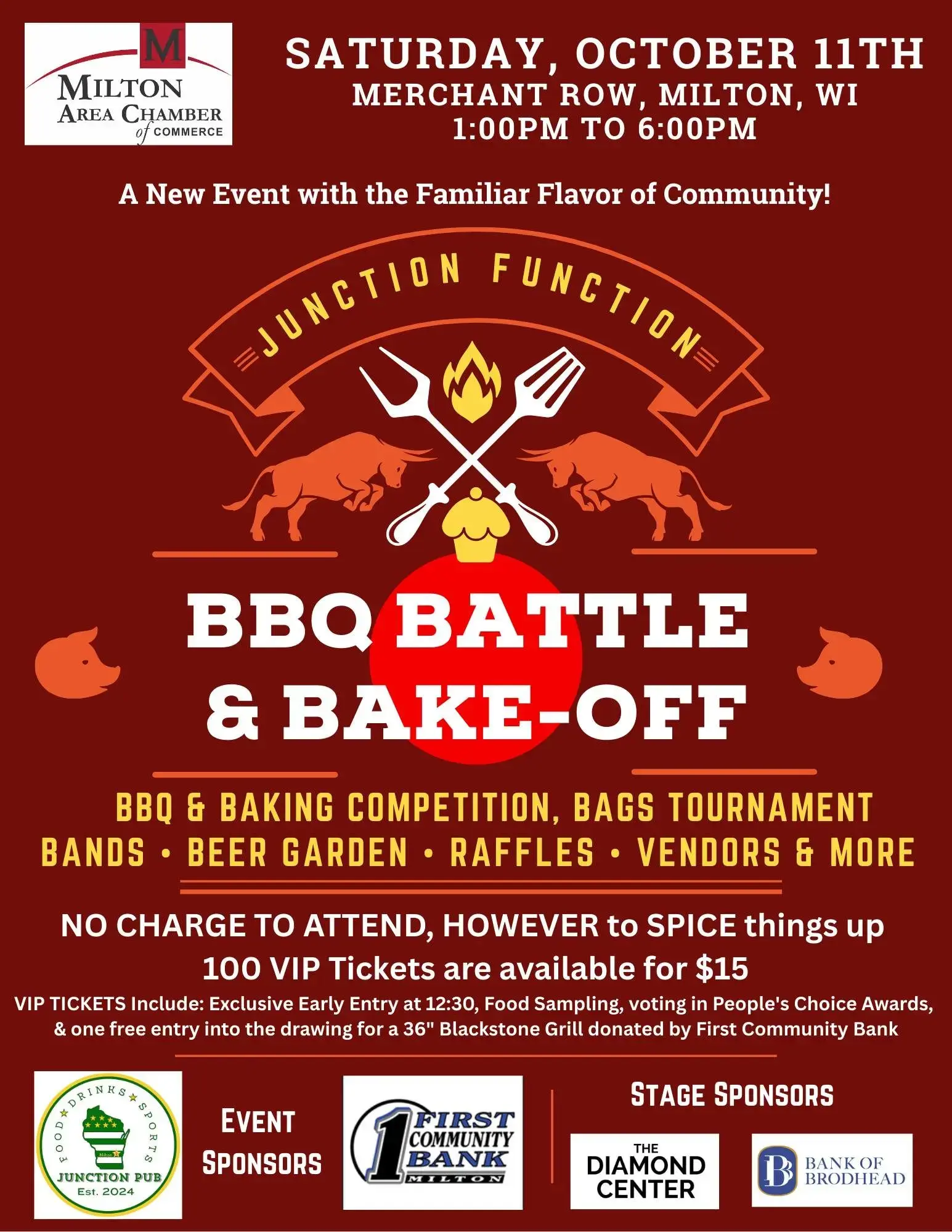 Come on down to Merchant Row in Milton to celebrate the Junction Function! Hosted by the Milton Area Chamber of Commerce. We will have BBQ competition, baking competition, vendors, bands, beer garden and bags tournament and raffles. 100 tickets being sold for taste testing. It’s a family friendly event so bring the kids and enjoy the day. All the details can be found on the Milton Area Chamber of Commerce facebook page or reach out to Deb at 608-868-6222...